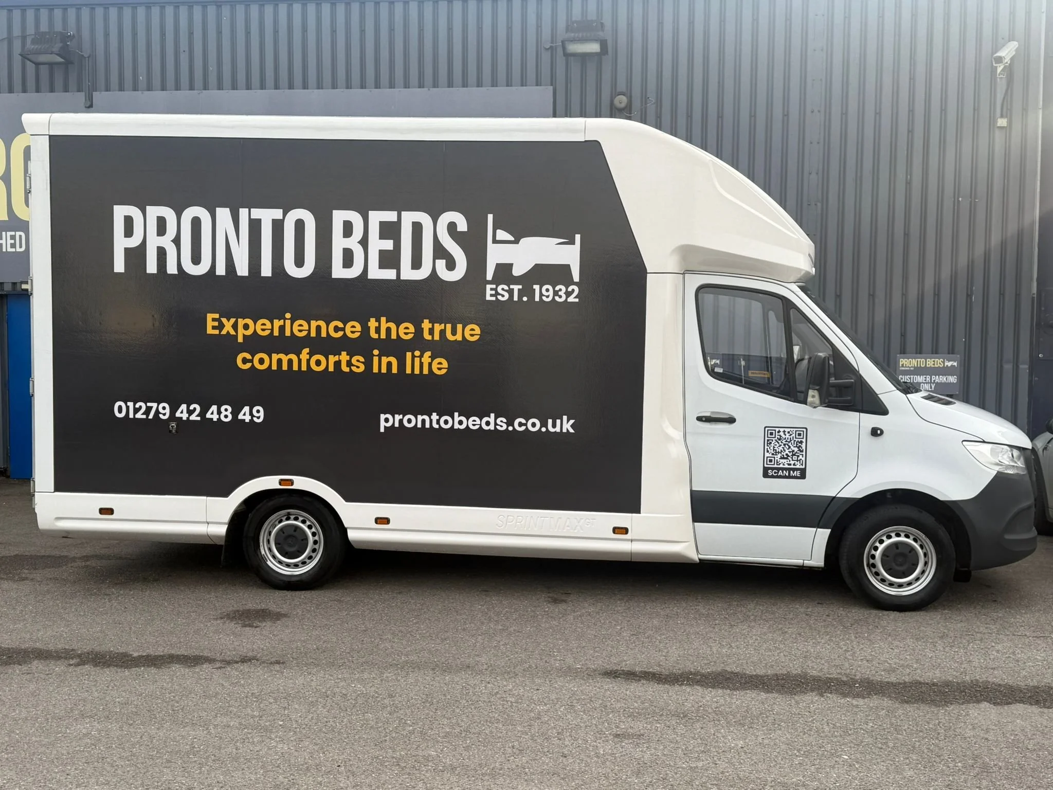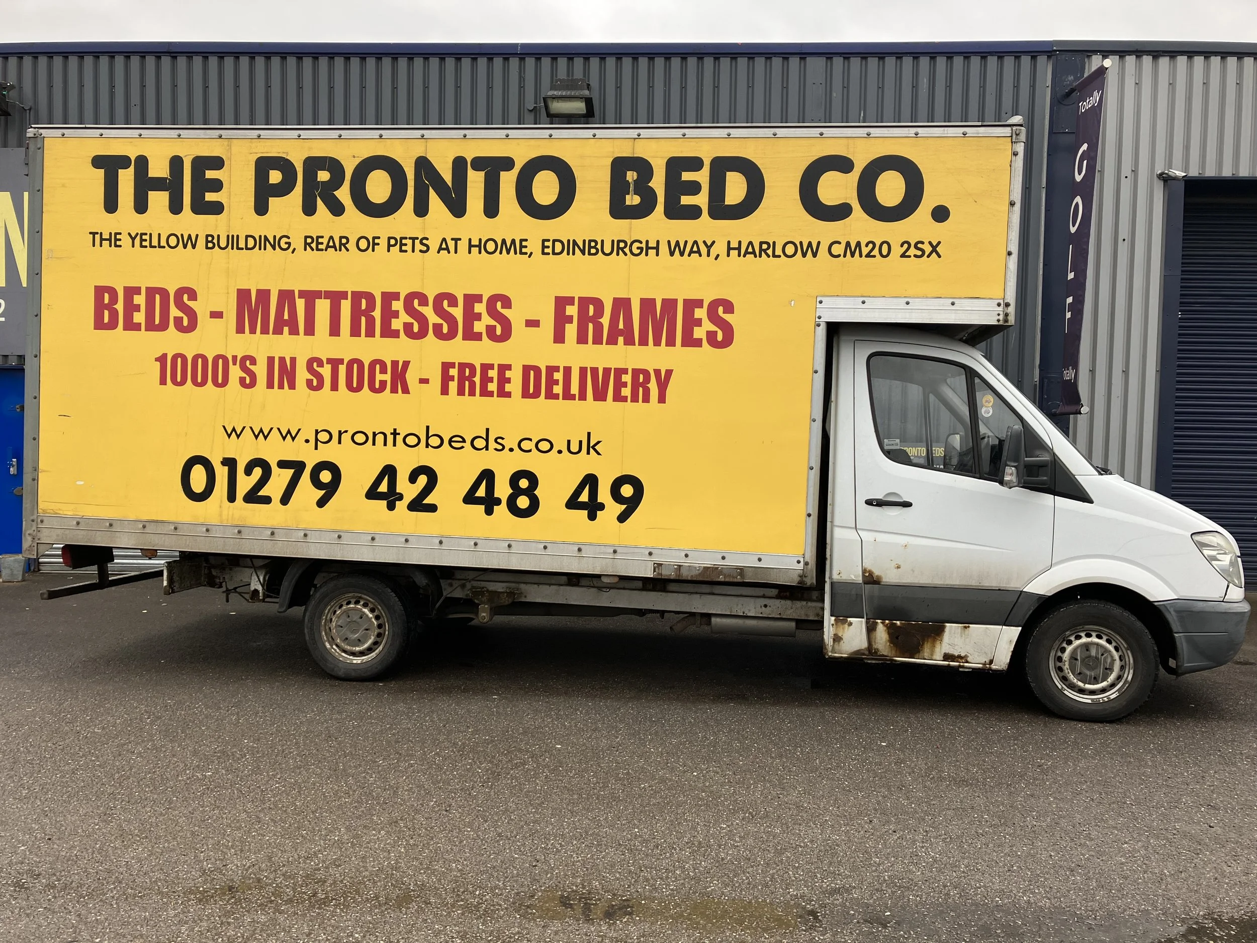 My mum, Debbie, leading the way. You can see the birth of the yellow 'Pronto Bed Co' branding—the start of our mission to get quality beds to customers without the 6-month wait.