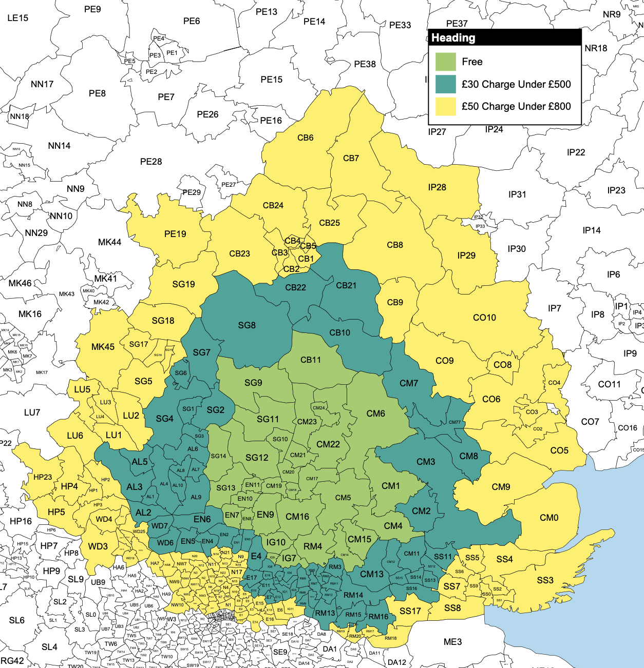 Yellow zone - delviery charge £50 under £800